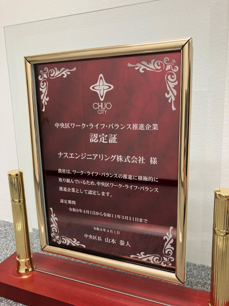 2026.04.01 「中央区ワーク・ライフ・バランス推進企業」の認定が今年度も更新されました。 「中央区ワーク・ライフ・バランス推進企業」の認定が今年度も更新されました。期間は2026年4月1日より2029年3月31日までです。仕事と家庭の両立や、男女がともに働きやすい職場の実現に向けて引き続きワークライフバランスの推進に取り組んでまいります。(取得年:2014年4月)